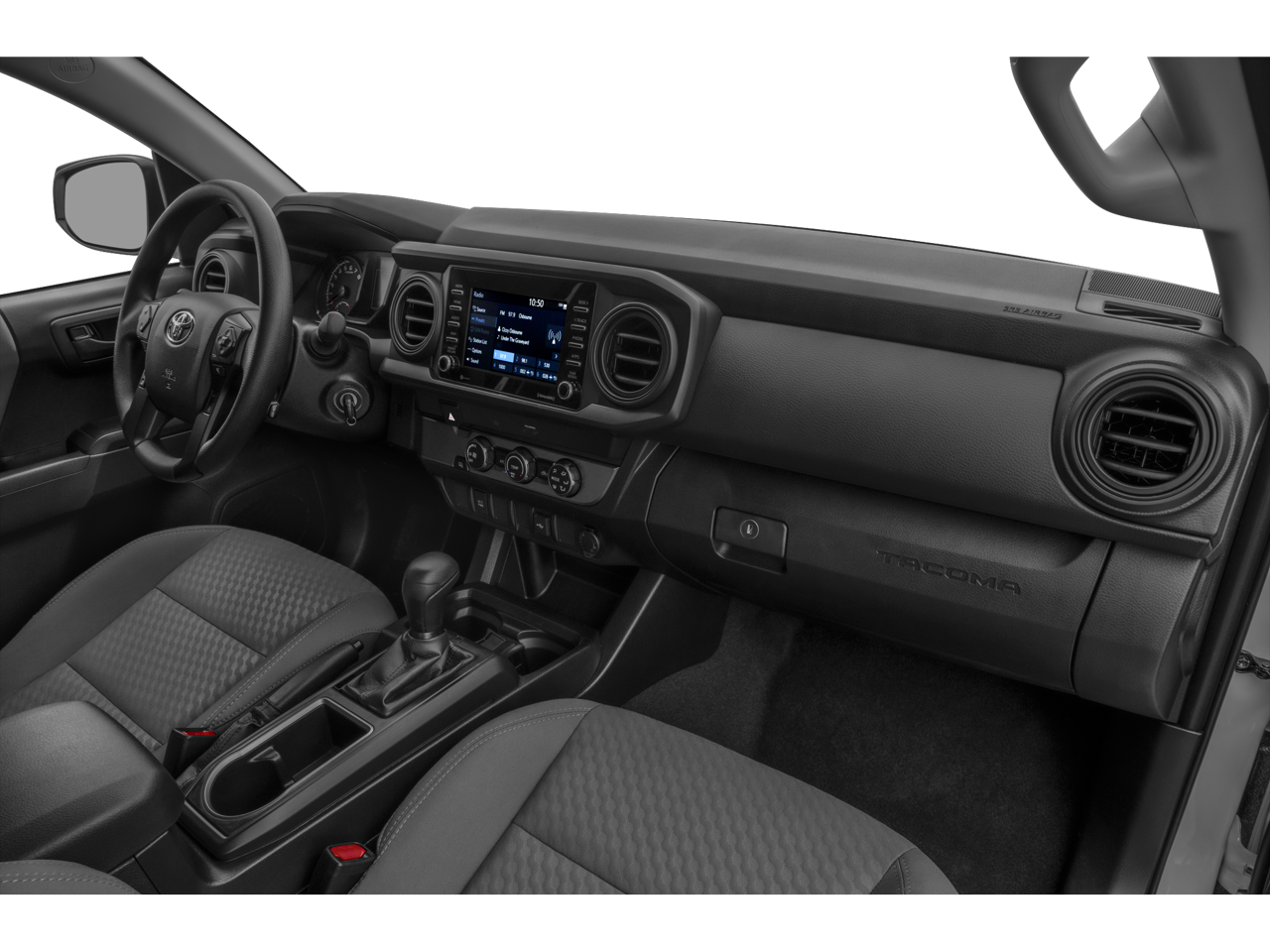 THIS VEHICLE HAS THE FOLLOWING FEATURES AND OPTIONS: SR Convenience Package (Remote Keyless Entry), Tacoma SR, 4D Double Cab, 2.7L SMPI DOHC, 6-Speed Automatic, RWD, White, Apple CarPlay/Android Auto, Auto High-beam Headlights, Exterior Parking Camera Rear, Speed control, Steering wheel mounted audio controls, 6 Speakers, ABS brakes, Air Conditioning, AM/FM radio: SiriusXM, AM/FM Stereo, Anti-whiplash front head restraints, Axle Ratio: 4.30, Brake assist, Bumpers: body-color, Driver door bin, Dual front impact airbags, Dual front side impact airbags, Electronic Stability Control, Emergency communication system: Safety Connect with 1-year trial, Fabric Seat Trim (FB), Front anti-roll bar, Front Bucket Seats, Front Center Armrest, Front reading lights, Front Seats, Front wheel independent suspension, Illuminated entry, Knee airbag, Low tire pressure warning, Occupant sensing airbag, Outside temperature display, Overhead airbag, Overhead console, Passenger door bin, Power door mirrors, Power steering, Power windows, Rear step bumper, Speed-sensing steering, Split folding rear seat, Tachometer, Telescoping steering wheel, Tilt steering wheel, Traction control, Variably intermittent wipers, and Wheels: 16 x 7J Style Steel Disc.